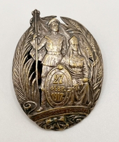 Russian empire. Badge of The Volyn life guard. The period of the Provisional Government (1917). The basis of the sign is a silver wreath of palm branches and wheat ears. In the center of the wreath is a silver figure of a soldier in the uniform of the Volyn life guard, holding a banner covered with red enamel in his right hand. The soldier leans on the shoulder of a woman in a national Russian costume, representing Free Russia, with his left hand. The woman holds her right hand on an oval shield with a convex inscription "February 27, 1917" . in her left hand, the woman holds a Laurel branch. At the bottom of the wreath is a ribbon with a convex inscription "VOLYNETS". Soldiers of the reserve battalion of the life guard of the Volyn regiment who directly participated in the February events of 1917, the badge was issued with the name and surname of the recipient engraved before the word "Volynets". On this sign-the surname of the awardee -A.L.Hohrjakov