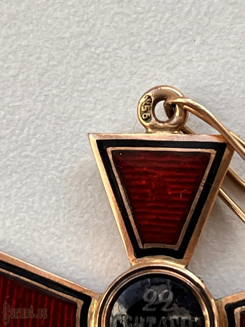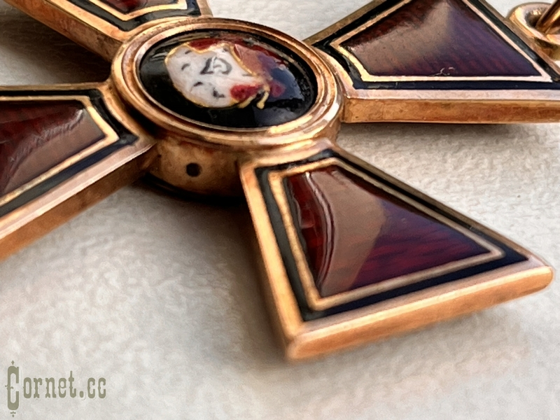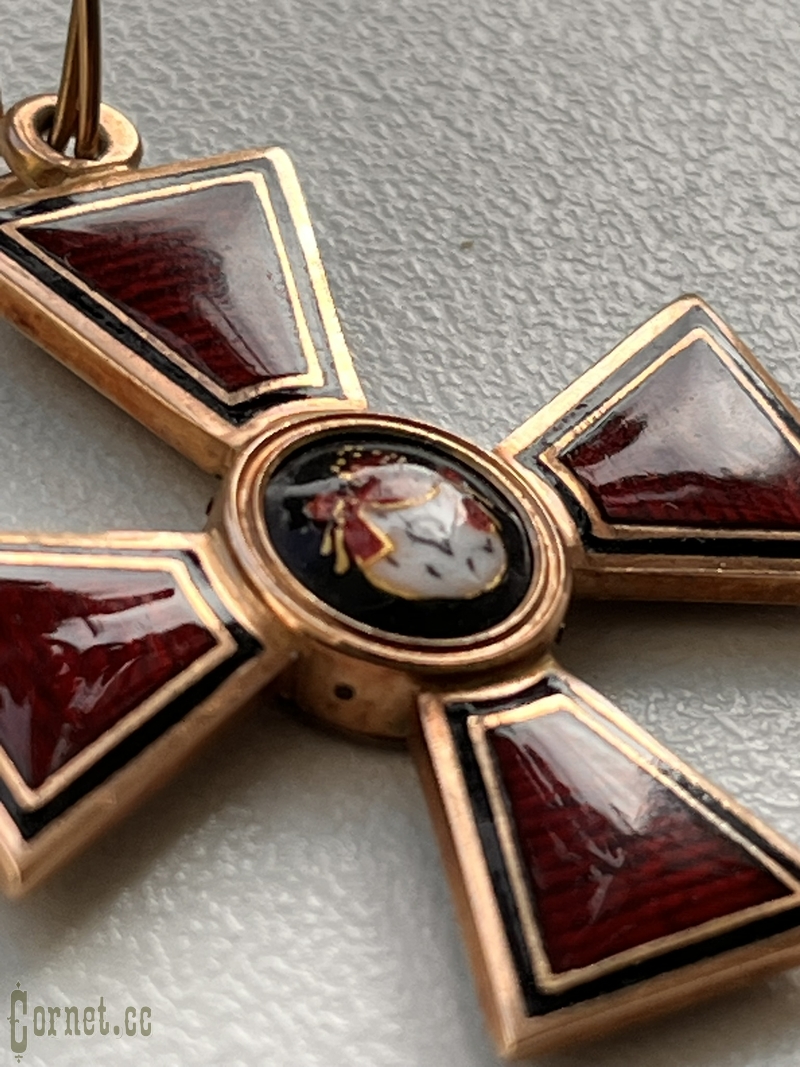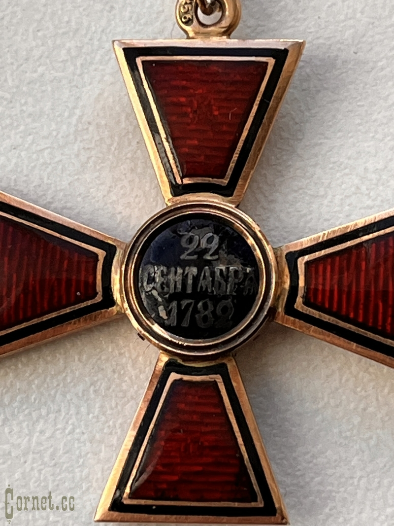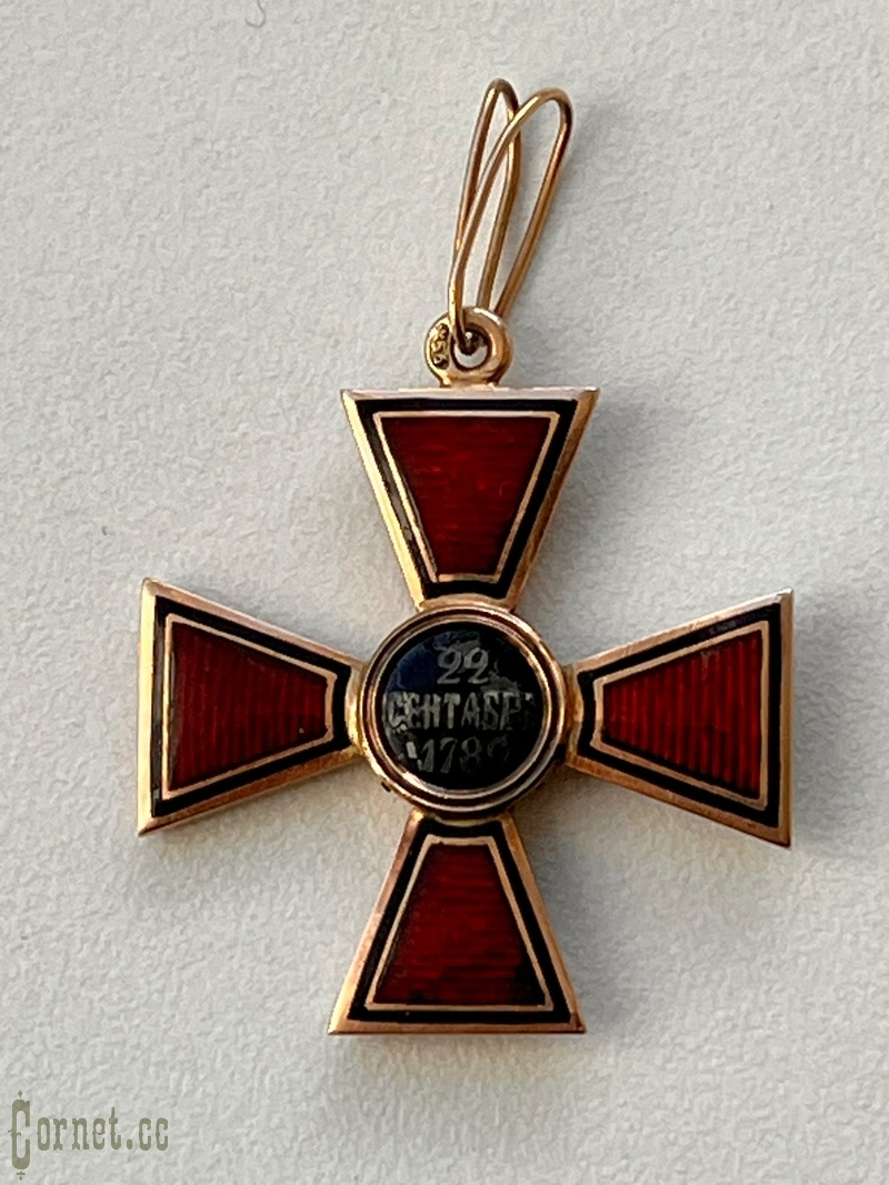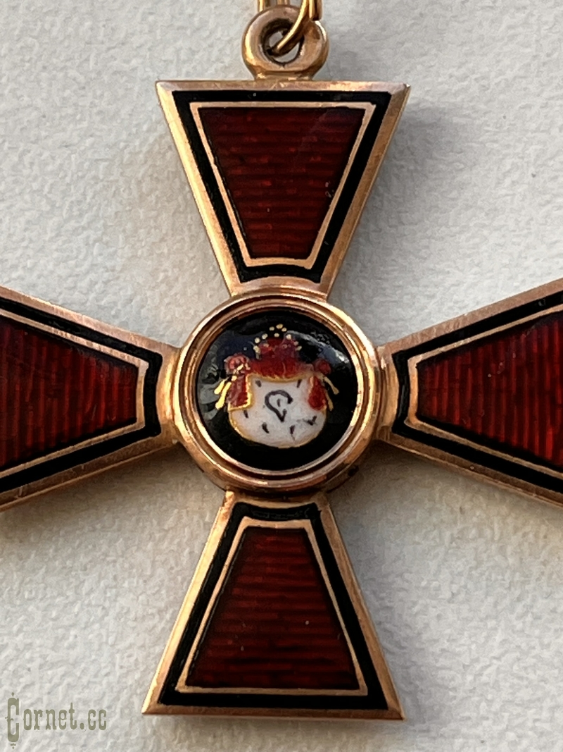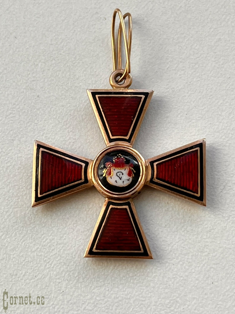 Russian Empire. The badge of the Order of the Holy Equal-to-the-Apostles Prince Vladimir of the 4th degree with dark blue enamel. St. Petersburg, 1860s. Keibel Firm. Hallmarks on the back of the badge of the order: on the ear - a sample of metal "56" with the city hallmark of St. Petersburg; at the ends of the cross under the enamel, at the top - the State emblem (capital order sign), at the bottom - the nominal stamp "IK" - Yogan Keibel. Very rare.