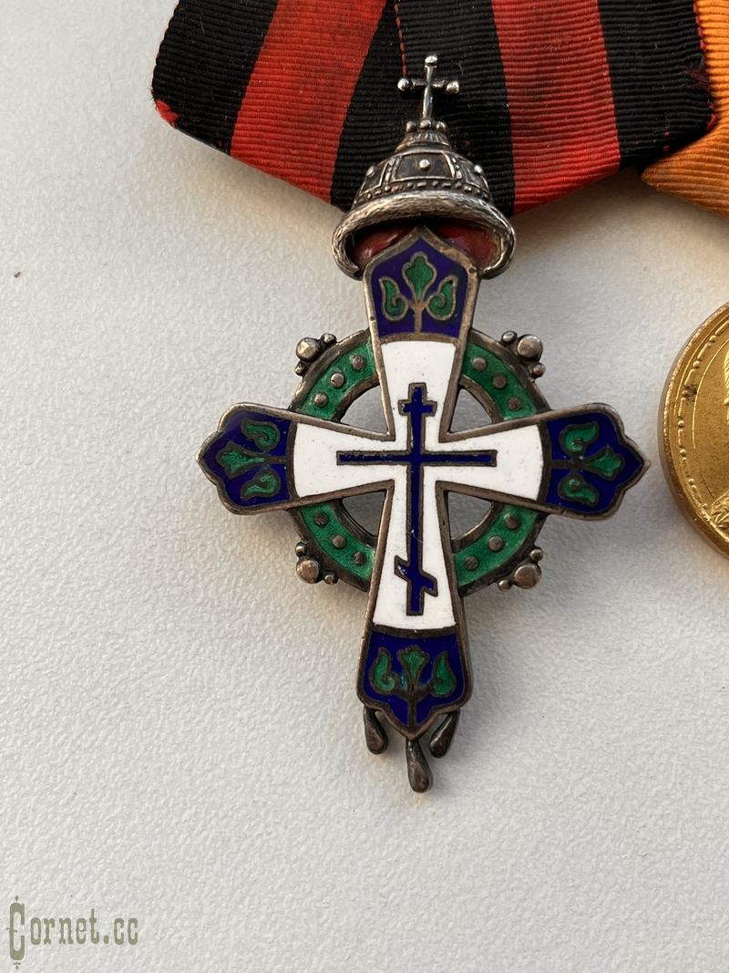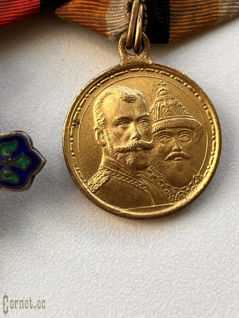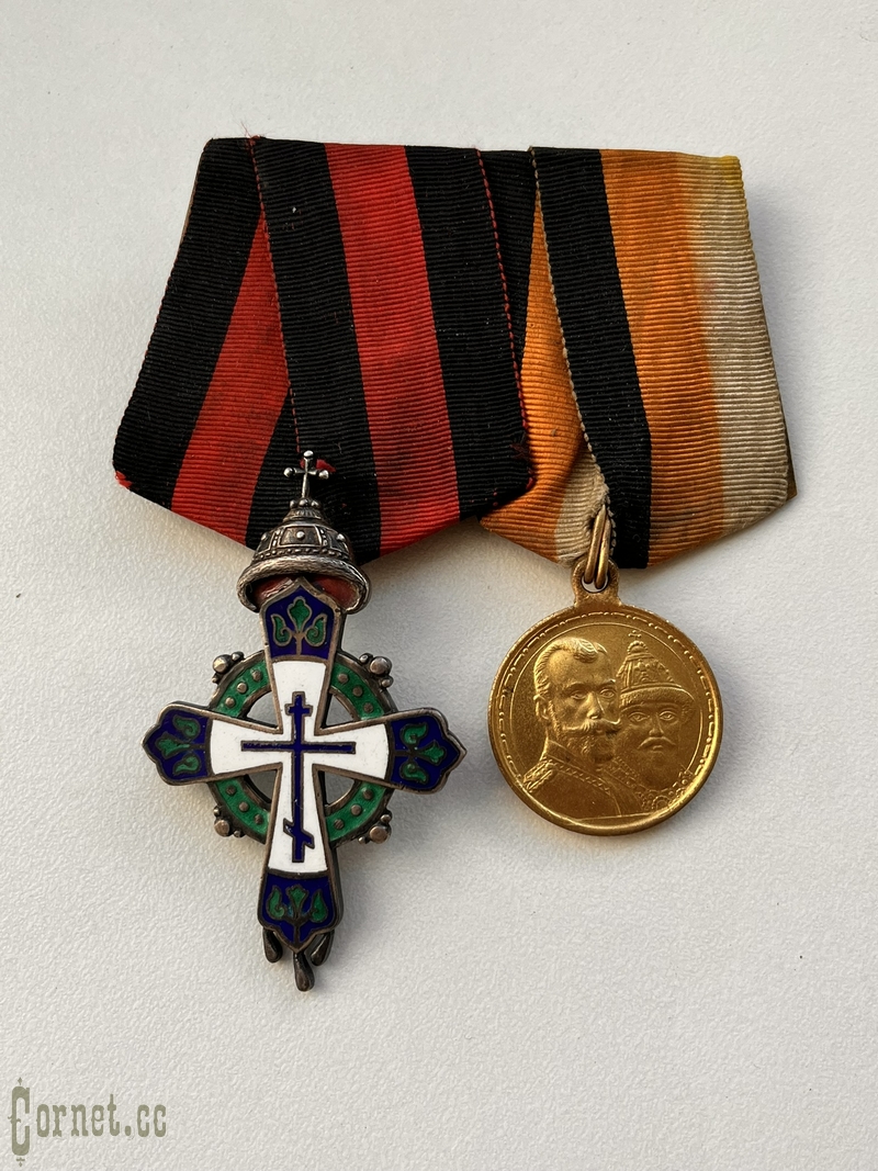 Russian Empire. January 24, 1913. The award block of the clergyman consisting of an award cross for clergymen in memory of the 300th anniversary of the Romanov dynasty on the ribbon of St. Vladimir and a medal in memory of the 300th anniversary of the Romanov dynasty on the ribbon of state flowers. On the reverse of the cross there is an oval stigma with an extremely rare sample - test tube "88," female head, Greek letter alpha. The mark of the master "AB" is Belov Alexander Dmitrievich, the owner of the workshop of silver products 1907-1913.