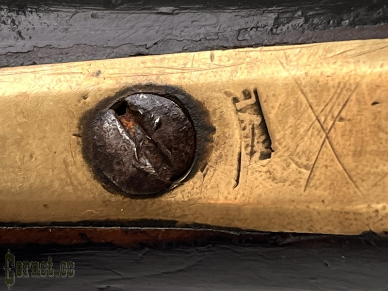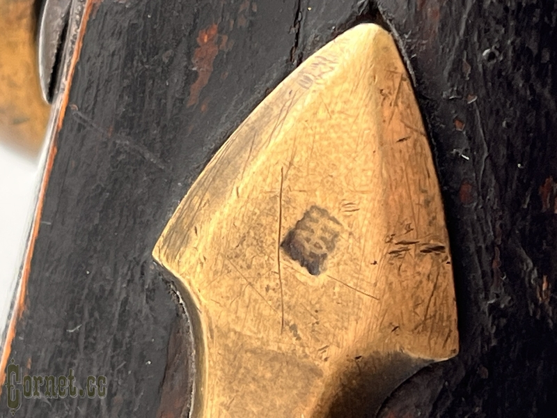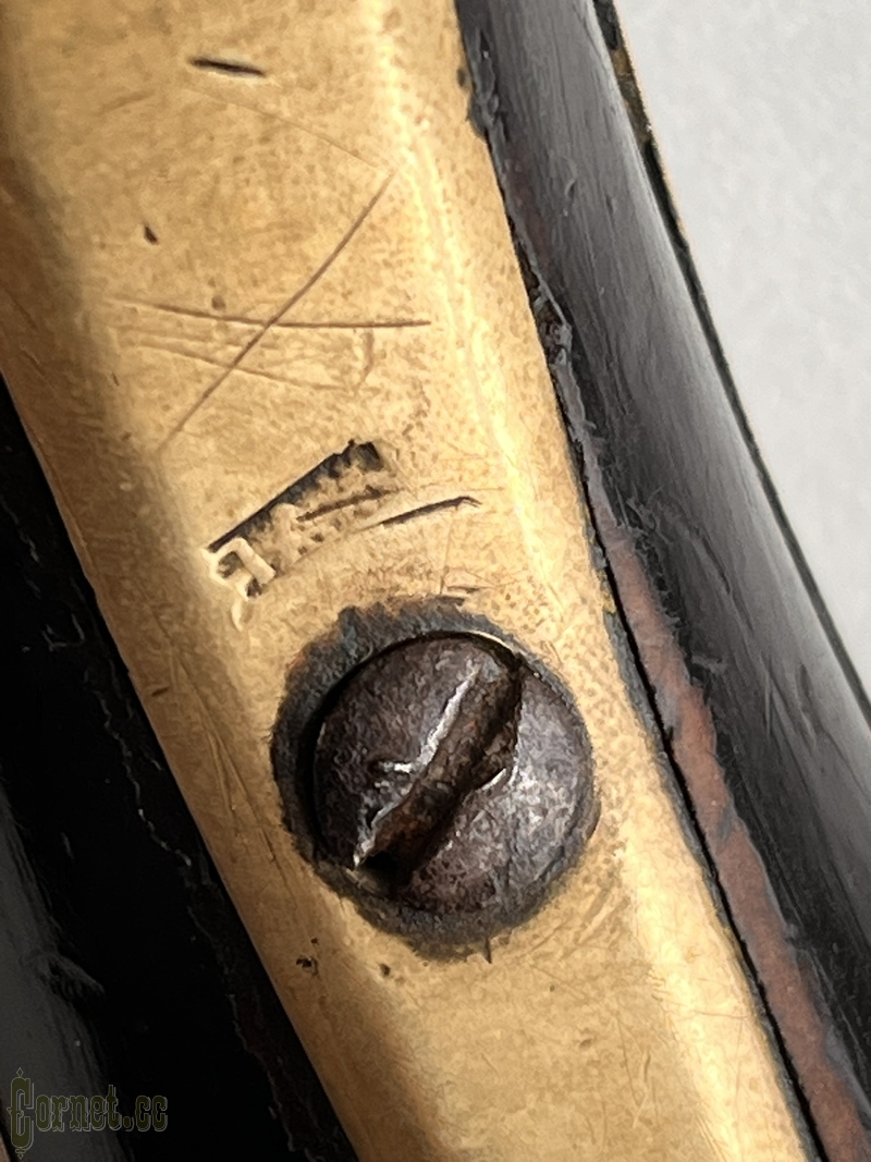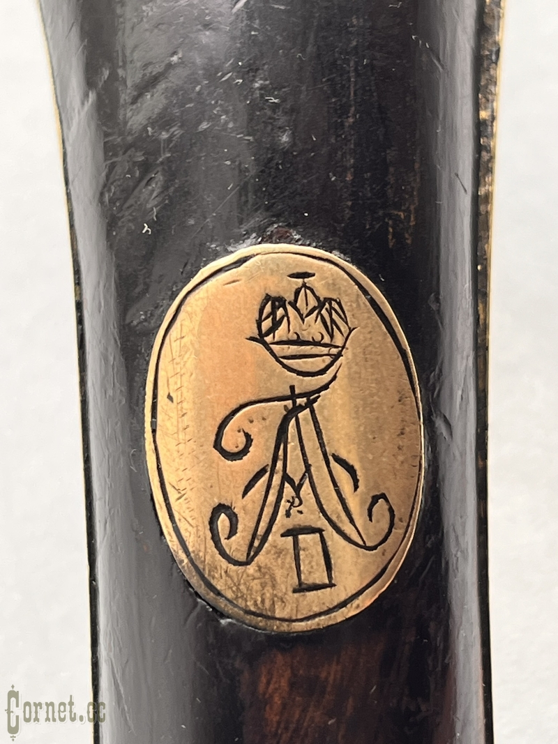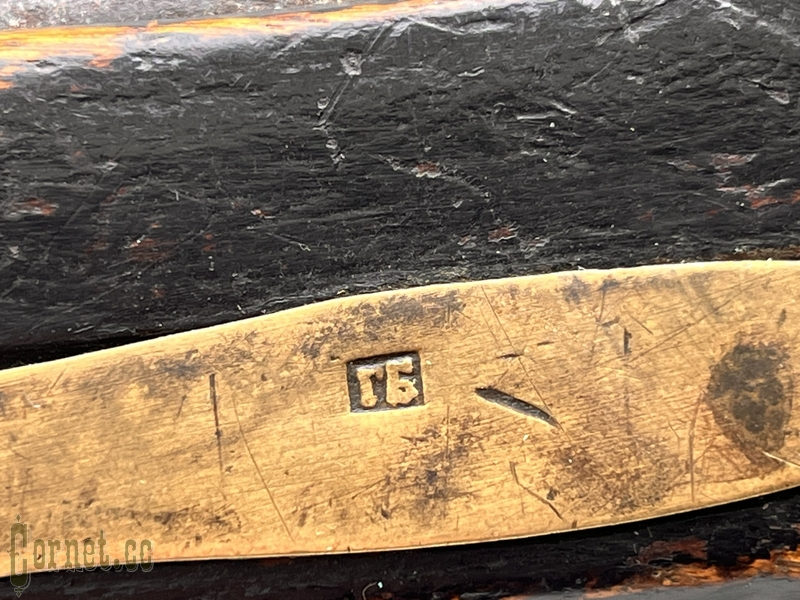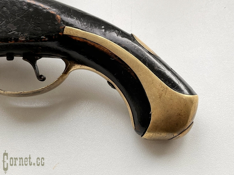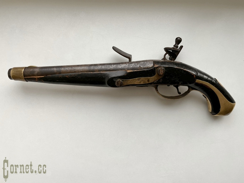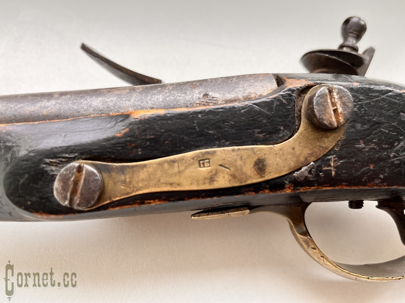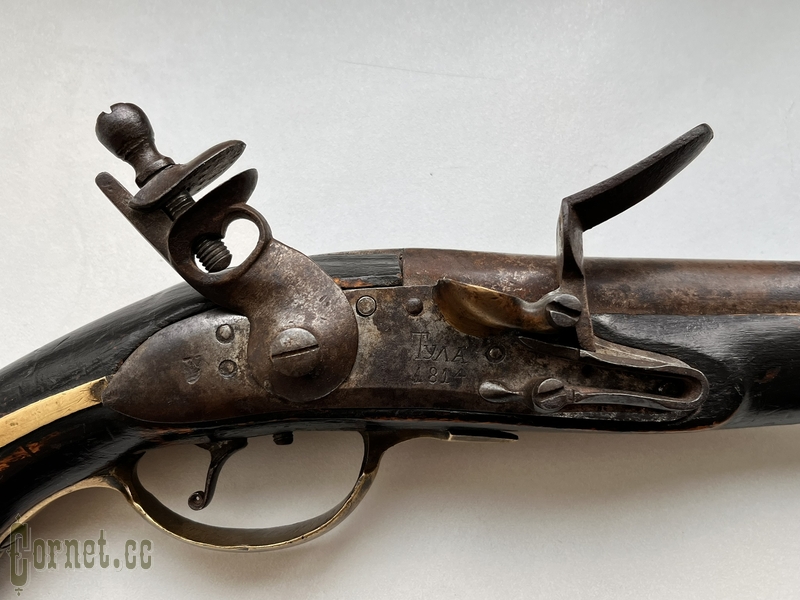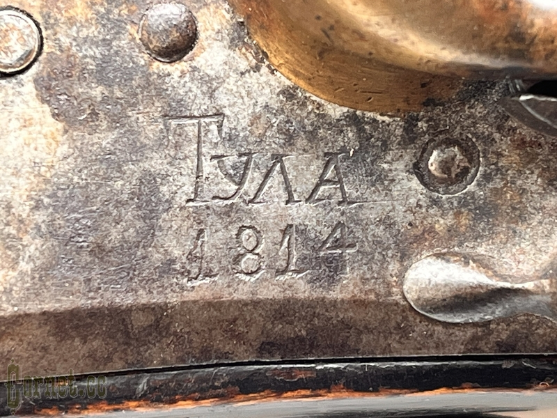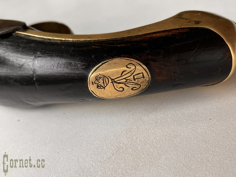 Russian Empire. Officer's pistol with flintlock. Made in the city of Tula in 1814. All metal parts are marked "GB," "NO." "PAGE." On the barrel, the mark "PM" and the acceptance and test mark. On the back of the handle is a light bronze lining with the monogram of Emperor Alexander the First.