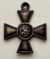Российская Империя. Знак ордена Святого равноапостольного князя Владимира 4-й степени. С.-Петербург, 1870-е годы. Фирма «Кейбель». Клейма на обратной стороне знака ордена: на ушке — проба металла «56» с городским клеймом С.-Петербурга; на концах креста под эмалью, вверху — Государственный герб (знак капитульного заказа), внизу — именное клеймо «IK» - Йоган Кейбель. Весьма редкий.