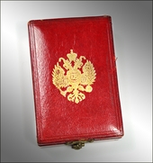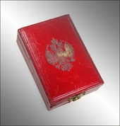 Футляр прессованой папки оклеен тёмно красным коленкором. На крышке тиснёная надпись золотистой краской "Знаки ордена Св.Станислава 3-й степени"