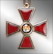 Российская Империя. Знак ордена Равноапостольного Святого князя Владимира 3-й степени. Конец девятнадцатого века. Мастерская Альберта Кейбеля. На реверсе нижнего луча клеймо "АК", верхнего государственный герб - орёл, обозначающий капитульный заказ на изготовление ордена. На ушке клеймо пробы золота 56 и герб С-Петербурга.
