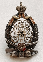 Российская Империя. Знак Лейб-гвардии Волынского полка. Периода Временного Правительства (1917 год). Основой знака служит серебряный венок из пальмовой ветки и пшеничных колосьев. В центре венка серебряная фигура солдата в форме лейб-гвардии Волынского полка, держащего в правой руке знамя, покрытое красной эмалью. Левой рукой солдат опирается на плечо женщины в национальном русском костюме, олицетворяющей Свободную Россию. Правую руку женщина держит на овальном щите с выпуклой надписью "27 февр. 1917г." В левой руке женщина держит лавровую ветвь. В нижней части венка расположена лента с выпуклой надписью "ВОЛЫНЕЦЪ". Солдатам запасного батальона лейб-гвардии Волынского полка, непосредственно участвовавшим в февральских событиях 1917 года, знак выдавался с выгравированными перед словом "Волынец" именем и фамилией награжденного. На данном знаке - фамилия награжденного - А.Л. Хохряков.