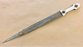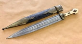 Российская Империя. Армейский кинжал кавказского типа, изготовленный на Златоусткой оружейной фабрике в 1905 году по заказу ГАУ. На устье ножен войсковое клеймо "2. Б. 24 М.А.Д. 2 " 2-я батарея 24 Мортирный Артиллерийский Дивизион, номер оружия по списку 50. Клинок ромбообразного сечения с тремя долами. На аверсе клинка клеймо ЗОФ и год выпуска, на реверсе приёмные клейма Главного Артиллерийского управления заглавная буква "А" с короной и просто "А". Рукоять традиционного вида для кинжалов, деревянная, крашенная в черный цвет, крепится тремя "гвоздиками". Ножны деревянные, обтянуты черной кожей. Прибор ножен из светлой бронзы с позолотой. Очень редкий и крайне интересный предмет для истинного коллекционера.