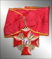 Российская Империя. Начало 20-го века. Знак ордена Святого Станислава 3-й степени мастерской фирмы "Эдуард". На реверсе верхней лопасти креста именник мастера "ВД" - Вера Дитвальд. На ушке пробирное клеймо изделий из золота после 1908 года "56 и женская головка в кокошнике". Знак и лента вложены в футляр, оклеенный красным коленкором с вытесненным золотистй краской государственный герб-орёл на крышке.