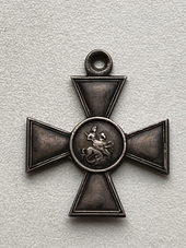 Российская Империя. Георгиевский крест 4 степени для лиц нехристианского вероисповедания №2636, частного изготовления. На ушке клеймо пробы 84, "лопатка" до 1908 года и именник мастера "ИС" - Иван Сазиков.